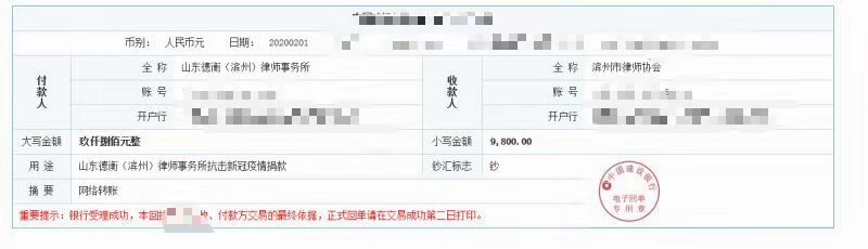 本所各位律師工作人員積極響應(yīng)號召,2000元、1000元、500元、300等等,根據(jù)個人不同情況,紛紛獻(xiàn)出愛心,倡議發(fā)出僅一天時間,就募集資金9800元。善款收齊后,由律所統(tǒng)一交濱州市律師協(xié)會代為捐贈。